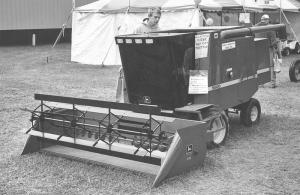 The mini combine is equipped with a 7-ft. header. The header lifts up and down, and the reel, auger and feeder house drum rotate. Even the straw spreader on back functions. A single electric motor controls all operations. The machine is powered by a Kubota 3-cyl., 22 hp diesel engine.