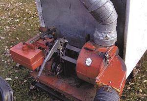 "I got the canvas from a company that uses them to cover piles of sugarbeets. I found the snowblower in a junk pile, and the flexible hose came off the end of a grain auger spout. The only thing I had to buy was the flexible hose that connects the mower to the vacuum.