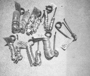He Uses Broken Hay Tines To Store Washes FARM SHOP Handy Hints 31-6-37 Joe Riccobuano, Pittsburg, Calif.: "I use broken hay tines to store washers. The tines in the photo are off an old Owatonna swather. I slide a tag on with the size next to the washers, and I hang each tine by its coil on a pegboard. The system eliminates any guesswork about the size washer I need. If I'm working on something and don't know how many washers I'll need I just take the whole tine with me."