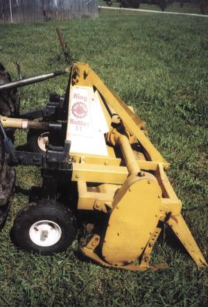 "My King Kutter 3-pt. mounted rototiller makes a nice seedbed for my organic grown vegetables. However, whenever the tractor wheels would drop into a hole, the tiller would dig down too deep. I used a pair of wheelbarrow wheels to solve the problem," says Ray Bjorgaard, De Soto, Kansas.