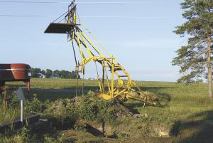 As a project engineer for Vermeer, Dunham knew what he would find when he stripped sheet metal, rollers and rubber belts off the baler. He welded an A-frame structure to the baler's tailgate to support a 4 by 10-ft. treated wood platform with 1 1/4-in. square tubing safety rails on each side.