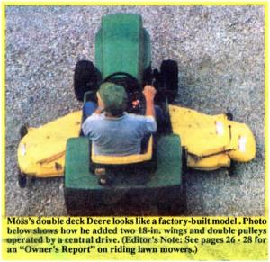 Double Deck Deere FARM HOME Lawn Mowers (31h,38) 17-4-1 An Indiana farmer who grew tired of the 3 1/2 hours it took him to mow his 1 1/2 acre lawn widened the deck on his Deere 318 riding mower by cutting apart an identical 48-in. deck to make 16-in. "wings" that increase the mower's total cutting width from 48 to 80 in.