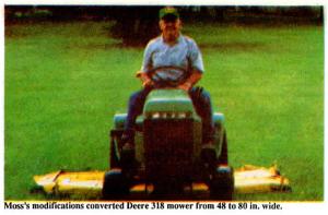 "It works perfect and looks like it was factory-built," says Moss, who built the 80-in. wide mower last winter. "It was easier to do than I expected and the benefits have been unbelievable. Not only is the 80-in. cut a real time saver, but the extra 16 inches on each side makes it easier than before to trim under shrubs and bushes. The biggest ad-vantage of the extra width comes when I'm mowing around trees. I can mow around trees in one continuous motion rather than having to stop and back up like I did before. The extra width also makes it much easier to turn at the end of the lawn because I don't have to turn as sharp.