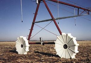 "The first time people see it they of-ten call it a plastic wheel, but it's not. The material it's made from is widely used in the aircraft and aerospace industry. Each wheel weighs about 100 lbs. less than wheels fitted with rubber tires of the same size. They'll fit any center pivot brand and can be used on any combination of towers.