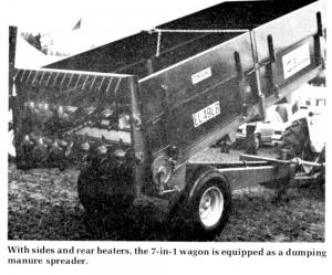 Excited farmers crowded around the new 7-in-1 wagon from the Forano Company of Woodstock, Ont. at a recent Canadian farm show. While they looked in, under and around the first-of-its-kind wagon, company spokesmen explained that it serves as a manure spreader, grain wagon, forage box, flatbed trailer, bunk feeder and handles just about any other farm chore.