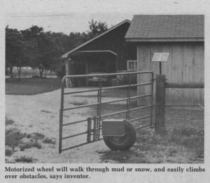 It's radio-controlled and consists of a 13-in. auto tire and rim driven by a sealed heavy-duty, 12-V powered electric motor. The wheel assembly, including a deep-cycle 12-V battery, simply bolts to any swing gate up to 30 ft. wide and weighing up to 2,000 lbs. There's no need to make a special track for the opener and nothing else to install. It has a positive cam lock that prohibits forced entry and can be opened with a garage door-type opener from the cab of your tractor or pickup.