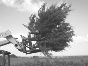 Cutting and clearing a pasture full of cedars or other invasive trees is fast and easy with the V Cutter fitted with grapple arms. It eliminates the need to have a second rig to haul away cut trees and brush.