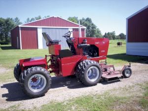 The tractor's frame was fashioned from parts off an IH 37 disk, while the transmission, axles, and 6.50 by 16 wheels are out of a pair of 1960's Chevrolet 3/4-ton pickups. A 4-cyl. water-cooled gas engine from an Owatonna self-propelled windrower supplies the power. The tractor articulates via a single 2 1/2-in. hydraulic cylinder that acts on a 1-in. dia. shaft. A double hydraulic pump that came off a combine provides power steering.