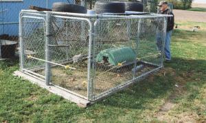 He covered the 8 by 12-ft. kennel with chicken wire and also rigged it all the way around with electric fence to keep raccoons out.