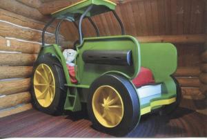 The tractor-shaped bed is built for a twin mattress with box spring and is made entirely of wood painted Deere green and yellow. Vander Ploeg built the bed in pieces and then put it together in his son's bedroom in a corner of his log cabin house. The cab, sides and wheels are separate from the frame. All bed components are either glued or screwed together.