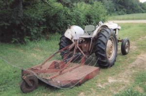 He simply laid a 6-ft. wide, curved panel section off a wire corn crib on top of the mower and tied it down to the mower's frame. He uses his Ford 860 tractor to pull the mower.