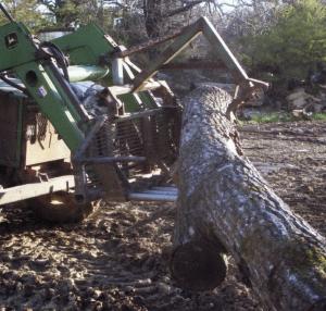 Travis uses the squeezer clamp to block up logs when cutting firewood. "I slide the forks under the log and clamp down on top. I can raise the log to a comfortable height and cut wood without having to bend over."