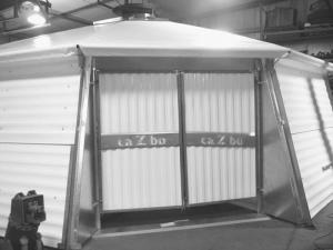 A translucent fabric roof is attached over the top along with an adjustable cover to the chimney/core. At that point the approximately one-ton structure can be lifted into place by a boom on a tractor loader.