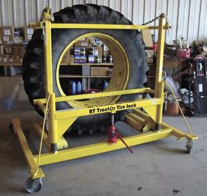 The RT Tractor Tire Jack rides on 4 heavy-duty steel wheels and comes with a 6-ton, 2-stage jack. It can handle tires weighing up to 6,000 lbs. A pair of adjustable arms, one set about 5 ft. high and the other 2 ft., fit into brackets on either side of the main frame. The arms can be moved in or out by changing the position of a pair of pins. The tire sits on a free-spinning rollbar at each side of the frame. Vertical uprights that support both the arms and rollbars ride up or down on pipes at each side of the frame.