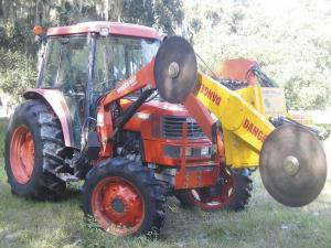 ChopZilla Prunes Fast And Clean WOODLOT EQUIPMENT Miscellaneous An attachment developed to top and hedge blueberry shrubs in Florida is catching on across the country for all kinds of pruning jobs With two 24-in saw blades mounted on a rotating 7-ft beam and a vertical reach up to 15 ft ChopZilla means business “The blades spin at a constant rpm depending on the engine’s rpm and the boom rotation is variable from 0 to about 200 rpm’s ” says Don Whitman of ChopZilla LLC “It’s 100-percent hydraulically driven and quick-taches to the tractor or skidsteer It’s configured to run off one or three sets of hydraulics ” ChopZilla cuts limbs up to 3 to 5 in at speeds of 4 to 5 mph “A consultant to the blueberry growers says that besides saving time ChopZilla’s cut is so clean ” Whitman adds That’s important to reduce stress and plant diseases The machine’s ability to prune 12 to 15 acres a day saves many hours of labor The saw blades at about $200 each can be sharpened for about $50 apiece If they don’t cut into dirt they can last a long time At 800 lbs the ChopZilla’s main requirement for a tractor is that it has at least a 9 2 gpm hydraulic flow The company has used it extensively on a 100 hp Massey Ferguson where ChopZilla reached 19 6 ft and a 7040 Kubota tractor Whitman notes that counterweight is needed for small narrow gauge tractors A 4-ft extension is required to use it on a skidsteer ChopZilla comes in two models The first which requires an adaptor to use it on tractors with just one set of hydraulic remotes costs $13 400 The second is for tractors with three sets of hydraulic remotes It sells for $12 900 A video on the company’s website shows ChopZilla in action Moving the boom engaging the blade and setting the speed are all safely controlled from the driver’s seat More applications are being discovered for the ChopZilla The Southwest Florida Water Management District uses it to maintain roads and cut brush And a ChopZilla was recently sent to Iowa to use for cutting limbs after ice storms The company currently sells ChopZilla direct but is working on setting up distributorships Contact: FARM SHOW Followup ChopZilla 5455 Scott View Lane Lakeland Fla 33813 ph 877 304-2467; www chop-zilla com