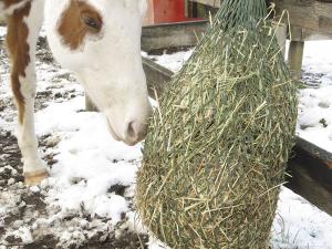 Blais warns that netting or net bags should never be left where shod horses can step on or into the netting. However, hay bags can be left on the ground for unshod horses, providing them with exercise and distraction as they push them around a paddock to get at the hay inside.