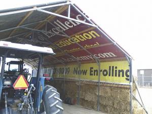 The purlins at the joints of uprights and rafters and ridgepole stabilize the trusses, but also provide a rounded angle for the tarps. To mount the billboard material, Carlson and Chadwick pulled one side up and over the top so the center seam ran down the ridge. Edges are well anchored to the bottom purlins on the sidewalls. The bale walls help protect the anchored edges from wind stress.