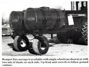 Bumper Jim units can be fitted to both two-wheel and four-wheel drive tractors. The largest 1,000 gal. unit (two 500-gal. tanks) weighs 1,200 lbs. (without the tanks). Carriages for two 400 or two 300 gal, tanks are also available. Tanks generally are used for herbicides but can also be used for liquid fertilizers and insecticides.