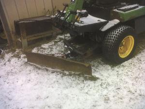 Home-Made Snow Blade TRACTORS Accessories I cut up an old water heater to make a 5-ft snow blade for my 1981 Deere F-911 front mount riding mower It attaches to an old 2-in receiver hitch that mounts on the mower’s original deck mounting arms The blade swivels on a big gear off an old combine which I split in half and welded to the blade One half of the gear is on top and the other half below it I drilled 3 holes into each gear allowing me to adjust the blade’s angle by simply changing the position of a pin A 2-in pipe is welded onto the gear and fits into the receiver hitch on the mower All it cost me was a couple hours of welding time John Blackwell Brantford Ont ph 519 755-9446