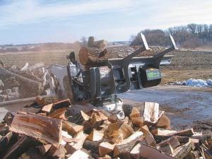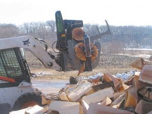 Logs are picked up with the processor’s forks, rolled onto the in-feed trough, and moved up to a butt plate by a chain conveyor and roller. Once in position, a high-speed chainsaw activates. When the block is cut, it falls into the splitting trough and is split with a 4 by 24-in. cylinder. The processor can cut wood into lengths up to 20 in. (28 in. optional) and can split the wood into 4, 6, or 8 pieces, depending on the choice of splitting heads. While it’s designed for a skid steer loader, some customers are making modifications to put the processor on excavators and tractors.