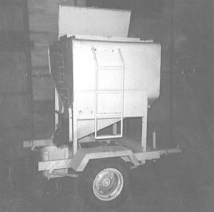 I'm just putting finishing touches on my second combine grain tank project - a portable feed bin. This time, I'm using the 45 bu. grain tank off a 660 Case combine. I've mounted it on a two-wheel trailer so I can haul it around the yard with my tractor or pickup. I made the trailer out of an old car frame and various odds and ends and fitted it with 15-in. implement tires. I made a frame so I could mount the tank on the trailer and bolted it to the trailer. I enclosed the top with part of the lid off a IH 510 grain drill. I fitted a combine mounting ladder onto the side of the tank so I can climb up to open the lid. Like the seed bin, it has a 30? slanted bottom and I unload feed through an 8-in. wide chute. I use it to fill 5-gal. pails of feed for the cattle.
