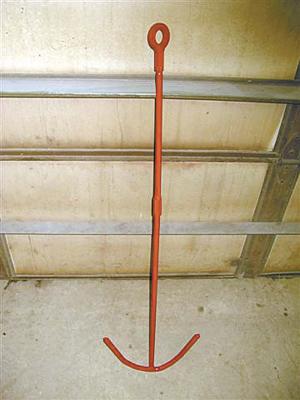 The tool consists of 5/8-in. cold-rolled rod, bent to an “anchor” shape. One long end of the rod has coarse threads sharpened to a point, so it easily pushes into the blockage of hay in the pickup.