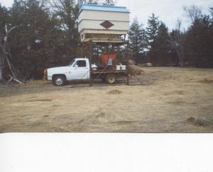 The box came with an 18-in. sq. opening and a slide gate that was opened and closed by turning a wheel on one side of the box. Kreitman’s hopper only holds 500 lbs. so he used 1/8-in. thick sheet metal to partially cover the opening, then made 2 small openings that are covered by slide gates. By turning an 8-ft. long metal rod he can open and close an 8 by 12-in. opening from the ground to fill the hopper. The other opening is only 6 in. sq. and is used to “top off” the load. Kreitman climbs onto the pickup’s flatbed to open and close it.