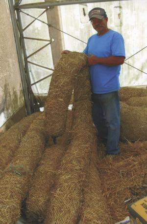 Gogerty and his sons, Jordan and Jason, produce waddles in 10, 20 and 25-ft. lengths and diameters of 9, 12, and 20 in. They follow Dept. of Transportation specs and use wheat straw purchased from certified weed-free fields. They bale the straw in small square bales and feed the slices into a home-built waddle maker.