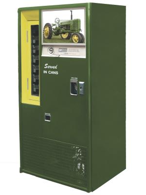 The machines are known in the trade as the Classic Vendo 63 and made to dispense 6 to 12-oz. bottles or 12-oz. cans. The window shows up to 7 different selections or flavors. The restored machines can be set to “vend” for free or in 5˘ increments from 5˘ to 75˘. Overall dimensions are 53 in. high by 27 1/2 in. wide by 21 1/2 in. deep. The empty machine weighs 345 lbs.