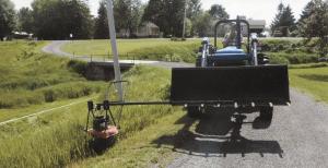 Cowan uses the loader-mounted mower to trim ditches on his property.
