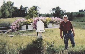 Six 11-in. high flower boxes set on a 1/4-in. thick metal panel that bolts onto a stand behind the mailbox, where a pair of angle iron braces provide support. The two flower boxes in the middle contain sweet potato vines and the others contain petunias. (Gilmore Greseth, 3515 270th St., Dawson, Minn. 56232 ph 320 752-4730)