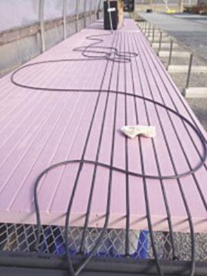 They started the project by laying 4 by 8- ft. by 2-in. thick pieces of pink insulation on a 60-ft. long growing table in the hoop greenhouse A router was used to cut 3/4-in. deep channels lengthwise in the foam boards to hold the heating tubes. Each pair of tubes connects to the hot feed manifold and the cold return manifold at one end of the table. Three zones were set up for the table with separate thermostats that started the heated fluid moving through the tubes when temperatures deviated + or – 3 degrees. The thermostats were placed in the growing media so temperatures reflected where the seeds were germinating, not the ambient air in the greenhouse.