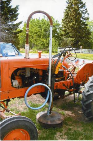 Ron Cole, Clive, Alta., converted his old Allis Chalmers WD tractor into a portable gopher gasser. The unit mounts on the left side of the tractor between the front and rear wheels.
