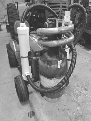 Gas runs things through two, 2-ft. long, 4-in. diameter, pvc pipes. They are connected in series and mounted to each side of the tractor. The gas travels first through one with a sock filter in it to trap larger particles. From there the gas continues to the second tube, which is filled with 1/2-in. thick sponge foam rolled up like a tube. It is designed to filter out finer particles.