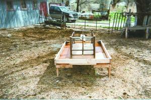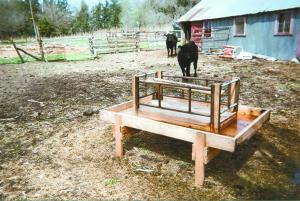The feeder is built out of 2 by 4, 2 by 6, and 2 by 12 lumber and has a 12-in. wide trough all the way around that catches alfalfa leaves as well as stems. The trough is also used to feed grain and pellet feed.