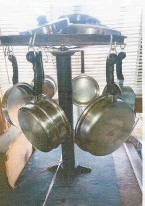 “I always wanted a pot and pan rack but there wasn’t room for one in my mobile home. The bicycle wheel makes a perfect rack,” says Baughman.