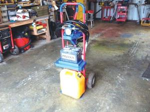 “A 12-volt battery sets on a wooden shelf at the middle of the dolly, with the transfer pump and its discharge hose mounted above it. There’s a 5-gal. container at the bottom. When refueling, I stick a 20-in. length of pvc pipe into the container to serve as a suction hose. “This setup eliminates the need to haul heavy containers around by hand and do any lifting, and there’s no need for an electric outlet to operate the transfer pump. I bought the pump and hoses at Harbor Freight for $104 (with a 20 percent off coupon) and already had the dolly and battery.”
