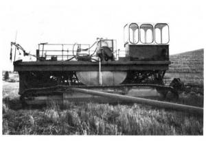 The sprayer is powered by a 275 hp Detroit diesel 8V-71 engine that's mounted up front. It powers a Caterpillar D6 drive train. The transmission, steering clutch and truck air brakes, as well as the air conditioned enclosed cab, are at the rear of the machine. Air cylinders are used to shift the transmission, operate the steering and transmission clutches, and to engage the sprayer pump.
