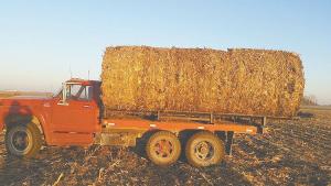 “It’s less expensive than a side dump hay trailer and lets me go down the road at highway speeds. It was relatively easy to build,” says Abba. “I use a loader tractor to load bales onto the truck, but I don’t need a tractor to unload them. I just go down the road, back up to the stack, and slide the bales off the back end of the truck. I use a loader tractor with pallet forks to both install and remove the frame. The same loader tractor is used to remove the frame and re-install the grain box. It requires removing just four bolts.”