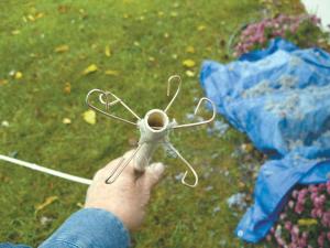 He decided to attach welding rods to the end of a pvc pipe. I drilled 3 holes in the end of the pipe, slipped the rods in and twisted the ends back so the rounded rod would hit the sides of the dryer vent pipe, says Ranta. At first they twisted to the side, so I used a hot glue gun to fix them in place.