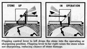 "There's no advantage in keeping the stone in the down position to provide continuous sharpening," Murphy explains. "There's too much danger of rocks or tramp metal damaging the stone and it's not necessary since the knives retain their sharpness if the edges are simply trimmed up two or three times during the day."