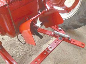 When the replacement guard arrived, Humeniuk noted the three L-brackets and bolts designed to attach the guard to the tractor. He cut away the L-bracket top center on the guard. He replaced it with a strap hinge, boring a hole to match the original in the L-bracket.