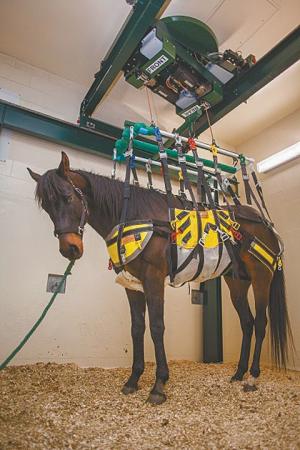 There’s a new high-tech option for healing from fractures and other musculoskeletal problems with horses, thanks to a new computerized horse lift that reduces and redistributes a horse’s weight while it is healing. The harness attaches to an overhead rail. As the horse gets better, the system allows the horse to carry more weight and build up strength.