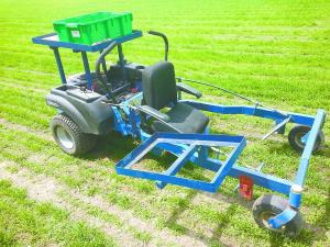Holliday framed in supports for a basket to the side of the operator’s seat, as well as another one above the rear. He later added a swivel from a boat seat so the operator can turn to drop the asparagus into the side basket.
