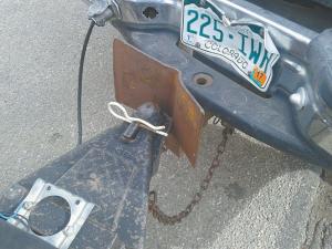 Gene Reed’s rear license plate has more than a few dings from hooking up his trailer, but there have been no new ones since he installed his hitch guide.