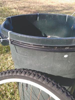 He starts with either the bike’s front or rear wheel. He removes the tire and tube as well as the spokes and wheel hub, leaving only the bare rim. Then he force fits the rim around the top edge of the barrel and drills a half dozen or so holes through the rim and plastic barrel, securing the rim to the barrel with zip ties.