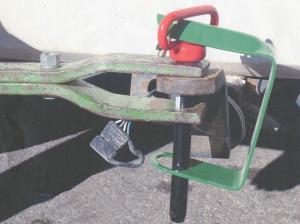 Invented by Minnesota farmer Ken Harwick, the U-shaped bracket measures 5 1/2 in. high by 2 1/2 in. deep. It comes with a small hole on top to insert a snap ring and a 1 1/2-in. dia. hole at the bottom for the pin. You slip the pin through the drawbar and implement tongue, keeping the pin up high enough so you can slide the top of the bracket through the pin handle. Then insert the pin through the bracket’s large hole, push the handle down, and insert the snap ring.