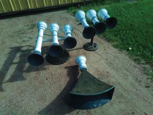 Over the years FARM SHOW has reported several times on how I turn giant, 2-ft. long cast aluminum air horns into an attraction at antique engine shows (Vol. 39, No. 5). I recently put together 2 different sets of 3 giant air horns made from public address speakers. They’re hooked up together and mounted on a pipe stand.  All 6 air horns are made out of 3-in. dia. pvc pipe for the body and have 8-in. diaphragms made from plexiglass. However, the pipes are of different lengths in order to produce different sounds. The horns sound like ocean liners.