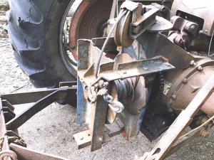 Schulz replaced the tractor’s original drawbar with a shorter drawbar made from heavy channel iron. The spool assembly is welded to the drawbar.
