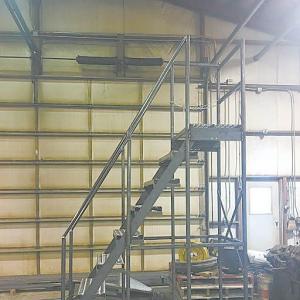 The stairway has horizontal cross bars on both sides about 3 ft. from the bottom. The driver places the skid loader forks under the cross bars, then raises the stairway and drives to wherever it’s needed.